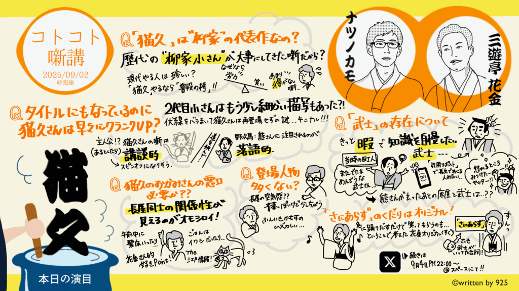 Xスペース(音声配信)にて、コトコト噺講の続きとして、三遊亭花金さんとナツノカモさんが、お客様からの質問も交えながら、約4時間、古典落語『猫久』について、コトコト語り納めました。コトコト噺〆の録音はこちらから(約4時間)